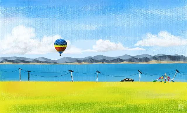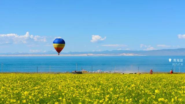 八月正是青海湖边油菜花盛开的季节,天的蓝、湖水的青、油菜花的黄,这些热烈的色彩把天地分成了一个个大的色块,像是巨大的调色盘。