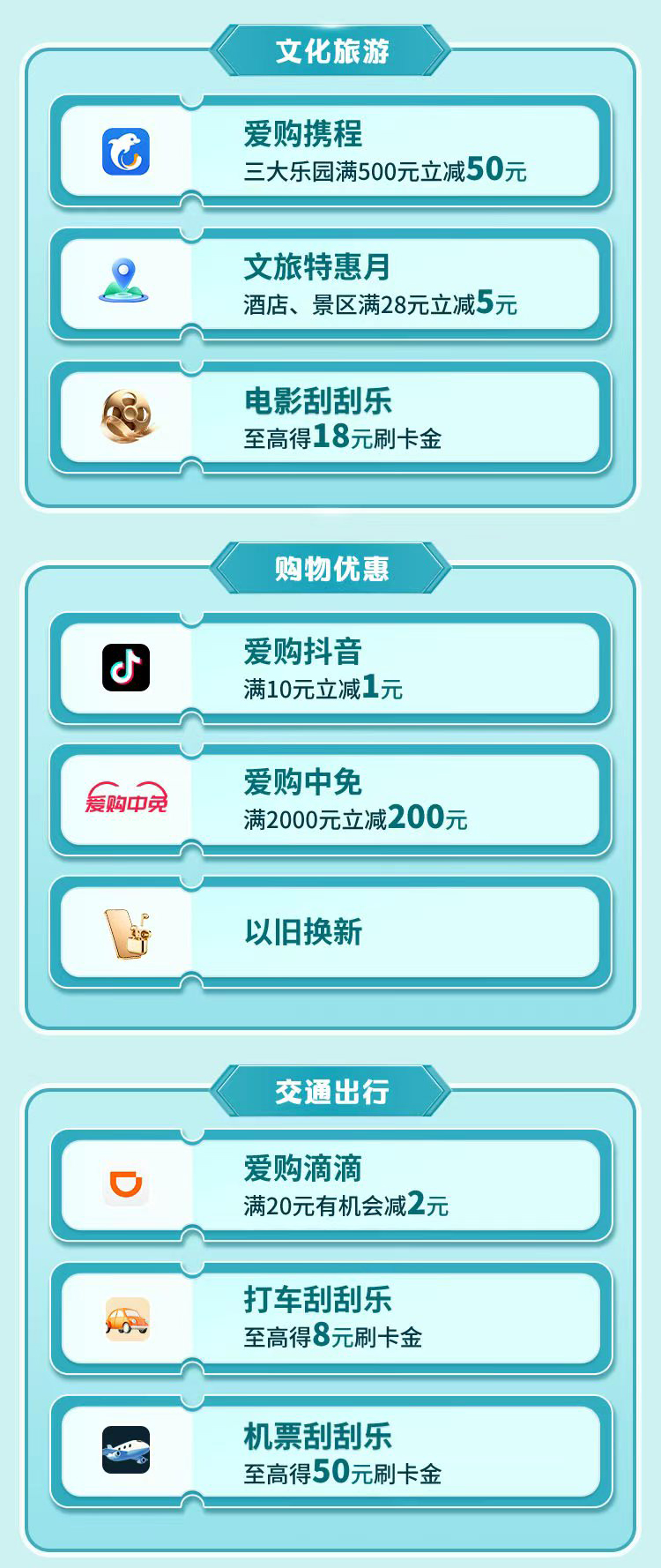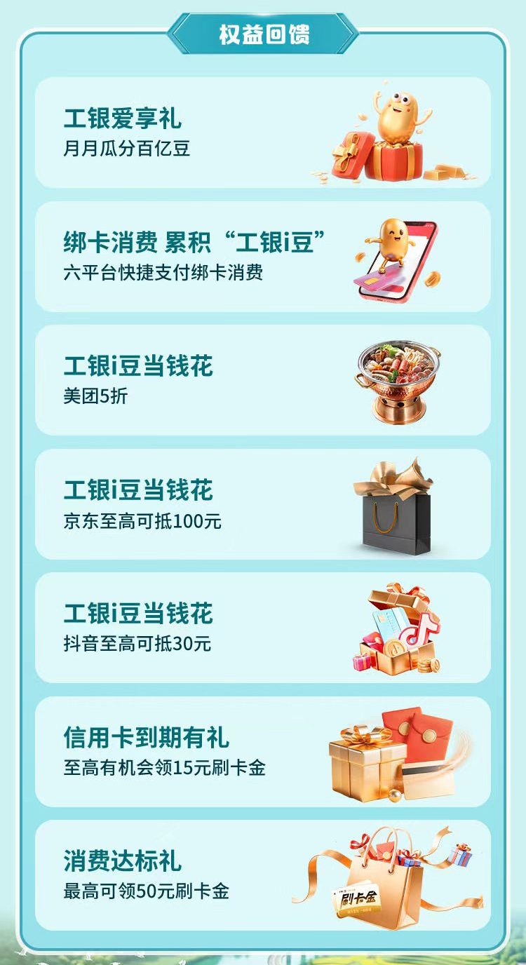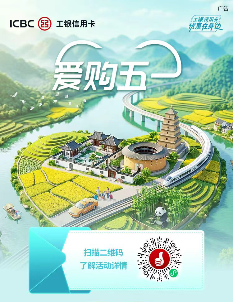 文旅惠民乐民,共享美好生活。2026年4月24日至2026年5月8日,上“工银e生活”App或“e生活plus”微信小程序,进入“爱购五一”活动页面,可查看五一期间工银信用卡相关活动,优惠享不停。使用微信扫描下方太阳码了解活动详情。